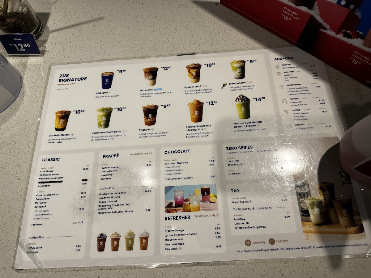 This menu is suited for casual visits, whether for a quick order or a light drink to accompany a casual meet-up. The focus is on coffee-based drinks, infused teas, and innovative mocktails, primarily without extensive food offerings detailed.